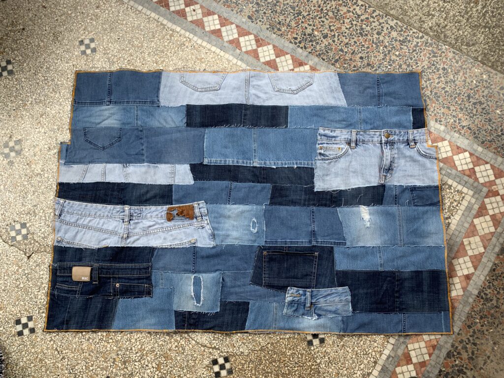 Aufwand: etwa 6h, 6 paar Jeans und zwei Nähnadeln. Jeans in Streifen schneiden (mit dem Rollmesser), aufstecken, aufnähen mit Zickzack oder Geradestich, grad wie es passt und kommt.