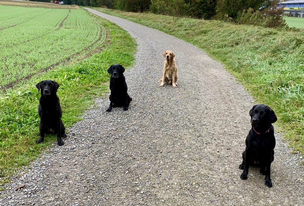 Vier Labrador Retriever, alle komplett anders. Es wedeln alle freundlich, es sind alle dauerhungrig, aber dann ist es mit der Einigkeit vorbei. Wir freuen uns auf eine spannende Woche!