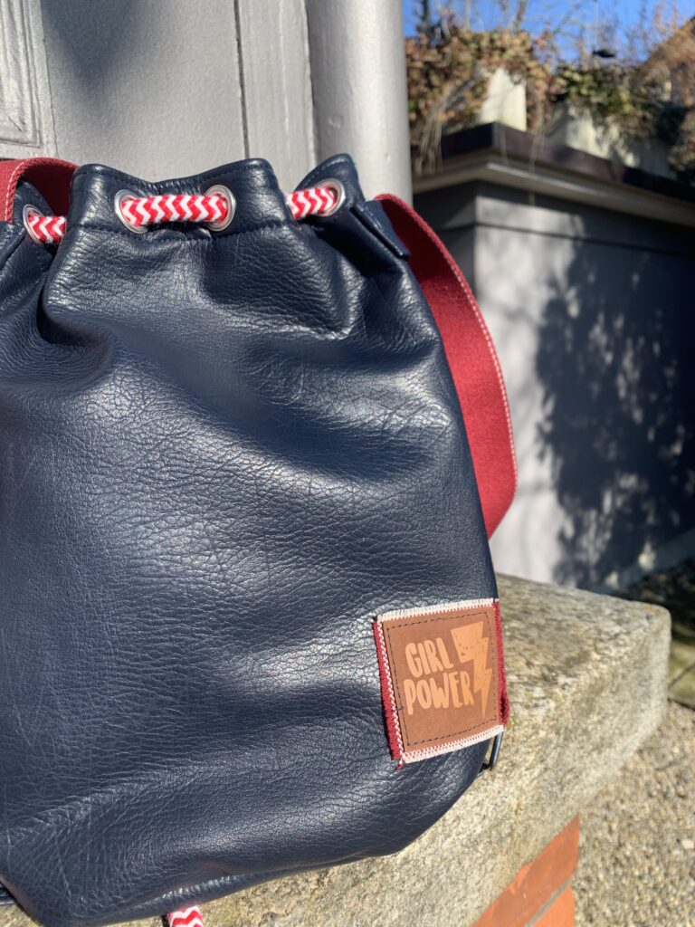 Schnitt: Beuteltierchen – Minimal Bitch Bag von www.followme-design.ch, Material: Kunstleder in Dunkelbau, Innenstoff Jacquard «Square«, Reissverschluss, Ösen alles von www.kreando.ch nur der Aufnäher mit dem Girl Power stammt aus der häuslichen Restenkiste.