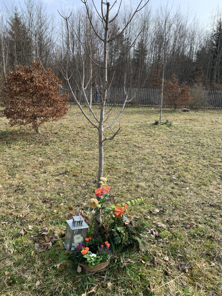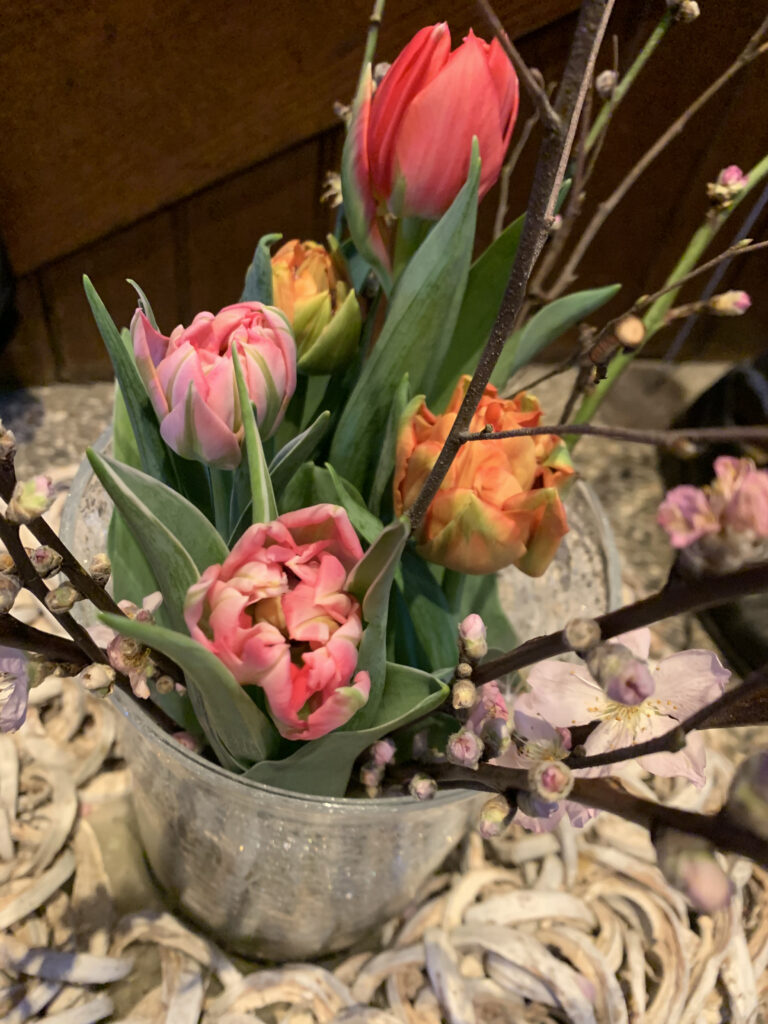 Bei soviel Power mussten auch für mich ein paar Tulpen rausspringen und auch die vertrockneten Blumen am Bäumli auf dem Friedhof haben einem frischen Bouquet Platz gemacht. Und das STRONG? stammt von einem Probennähen aus Resten von Erics Pulli. Das Motto «STRONG» passt. Das nehmen wir mit auf den weiteren Weg ins 2021!