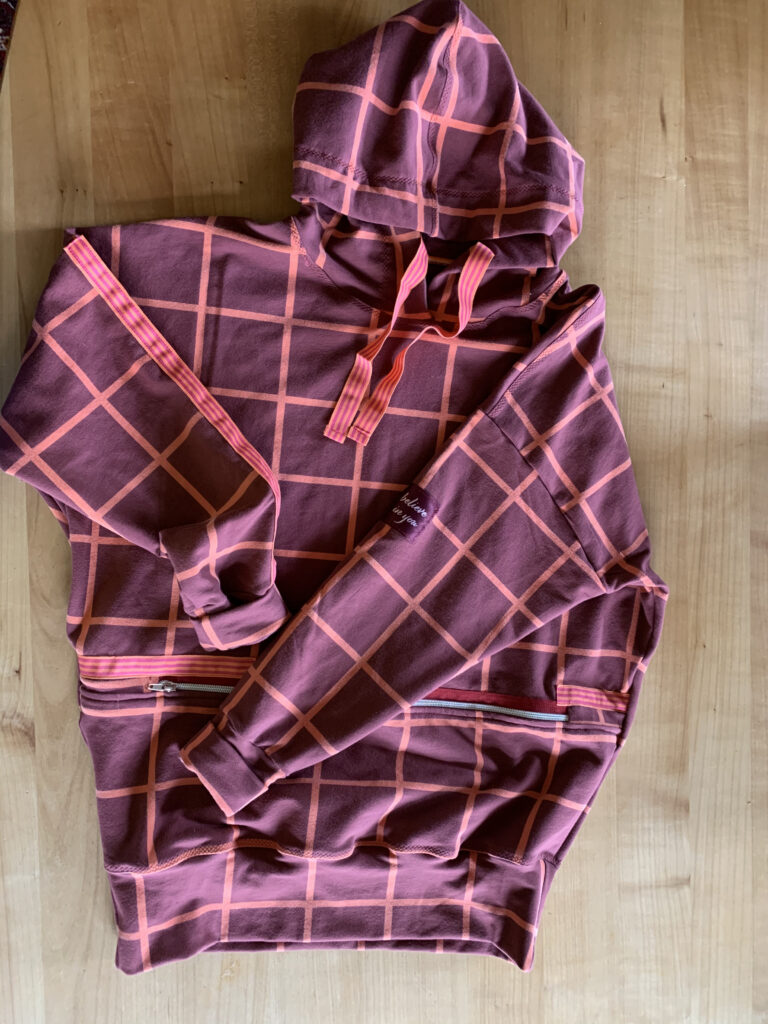 Material: Baumwolle – French Terry «Grid XL – bordeaux» von See You at Six über www.kreando.ch (ausverkauft), Patch: www.farbenmix.de, Schnitt: Senora FOXXIE von www.followme-design.ch