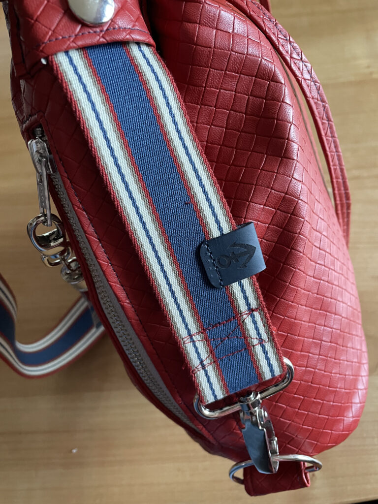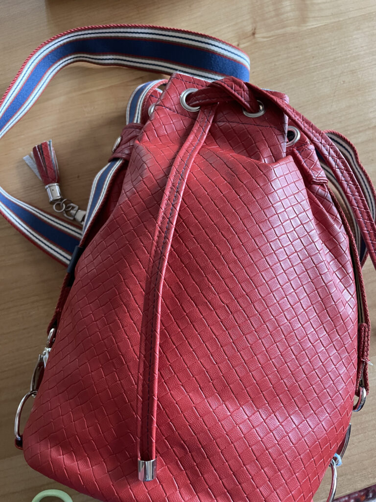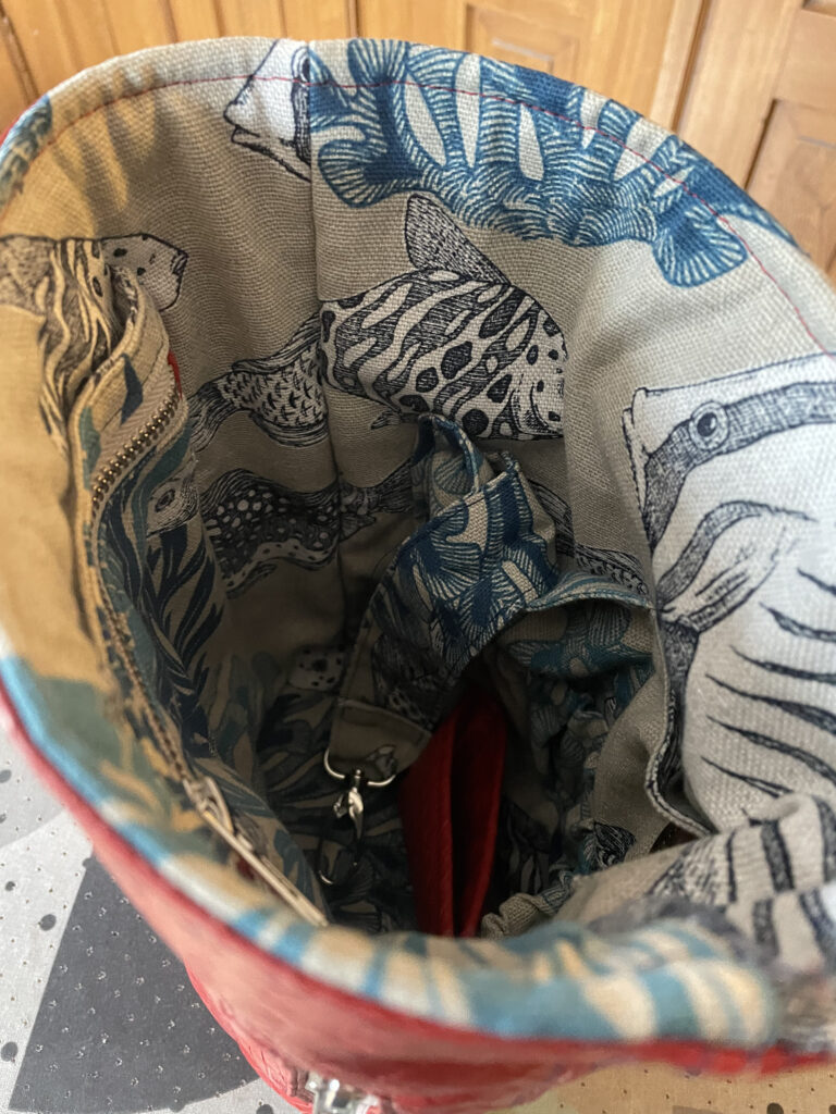 Material: Futter: Canvas mit Fisch und Korallengetier von Kreando, rotes, butterweiches und entsprechend «lebendiges» Kunstleder ebenfalls von Kreando, Ösen, Beschläge und Gurtband von Kreando / aus der Restenkiste.