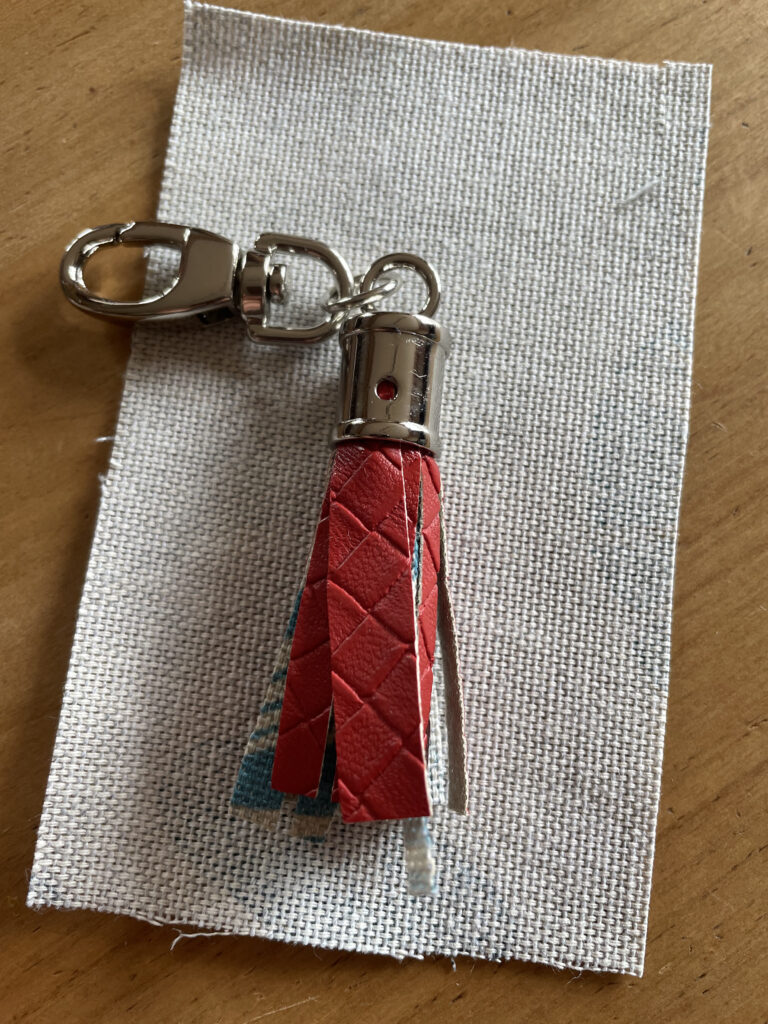 Übrigens, der Tassel, der Anhänger aus den Resten ist ganz einfach zu realisieren. Stoffe aufeinanderlegen in passender Länge, an einer Längskante aufeinander kleben, testen, ob es in den Rohling passt, notfalls kürzen, Fransen schneiden, fein, geduldig, dann Längskante mit Sekundenkleber bestreichen und alles eng, sehr eng, aufrollen. Tief durchatmen, in den Rohling wursteln, davor auch hier Sekundenkleber reinbuttern. Hoffen, dass nicht zuviel Leim rausquillt, WARTEN am besten über Nacht, sich freuen. Die Dinger halten erstaunlich gut – habe noch bei keinem ein Problem gehabt. Notfalls kann man die hier mit einem Faden querbefestigten (Loch in Rohling). Wenig Aufwand, Resteverwertung (ganz schick mit einem Bling-Bling-Faden drin), wertet das Teil massiv auf. Hier wäre noch die umfangreichere Anleitung bei Kreando.