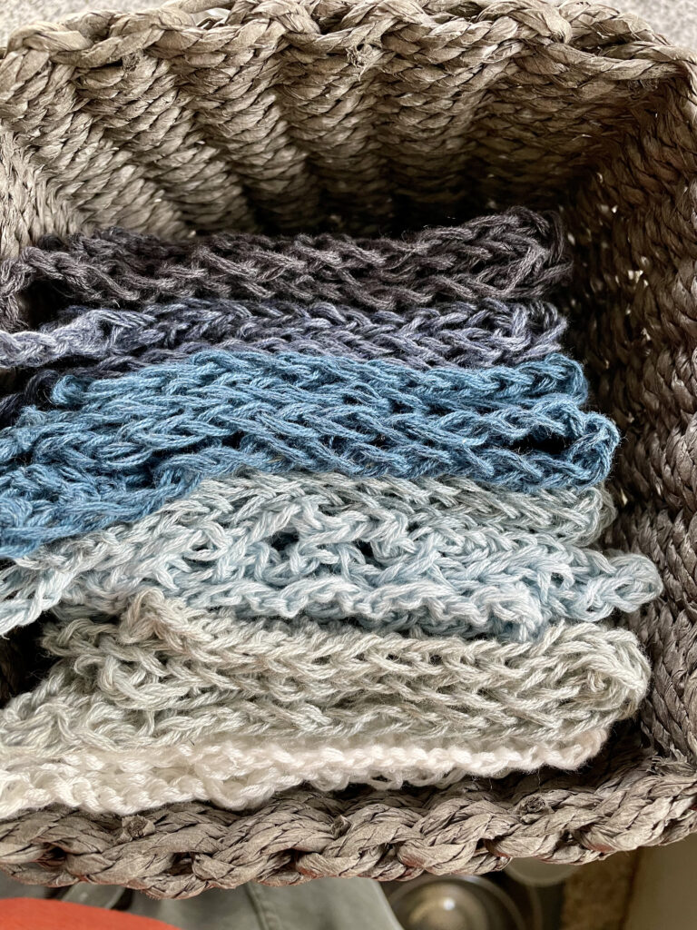 Aufwärts gehen auch meine handwerklichen Bemühungen gegen den Mikroplastik der Microfaserlappen. Jetzt sind die ersten 7 Küchenputzlappen fertig, jetzt kommt der Härtetest. Welches Muster, welche Grösse…