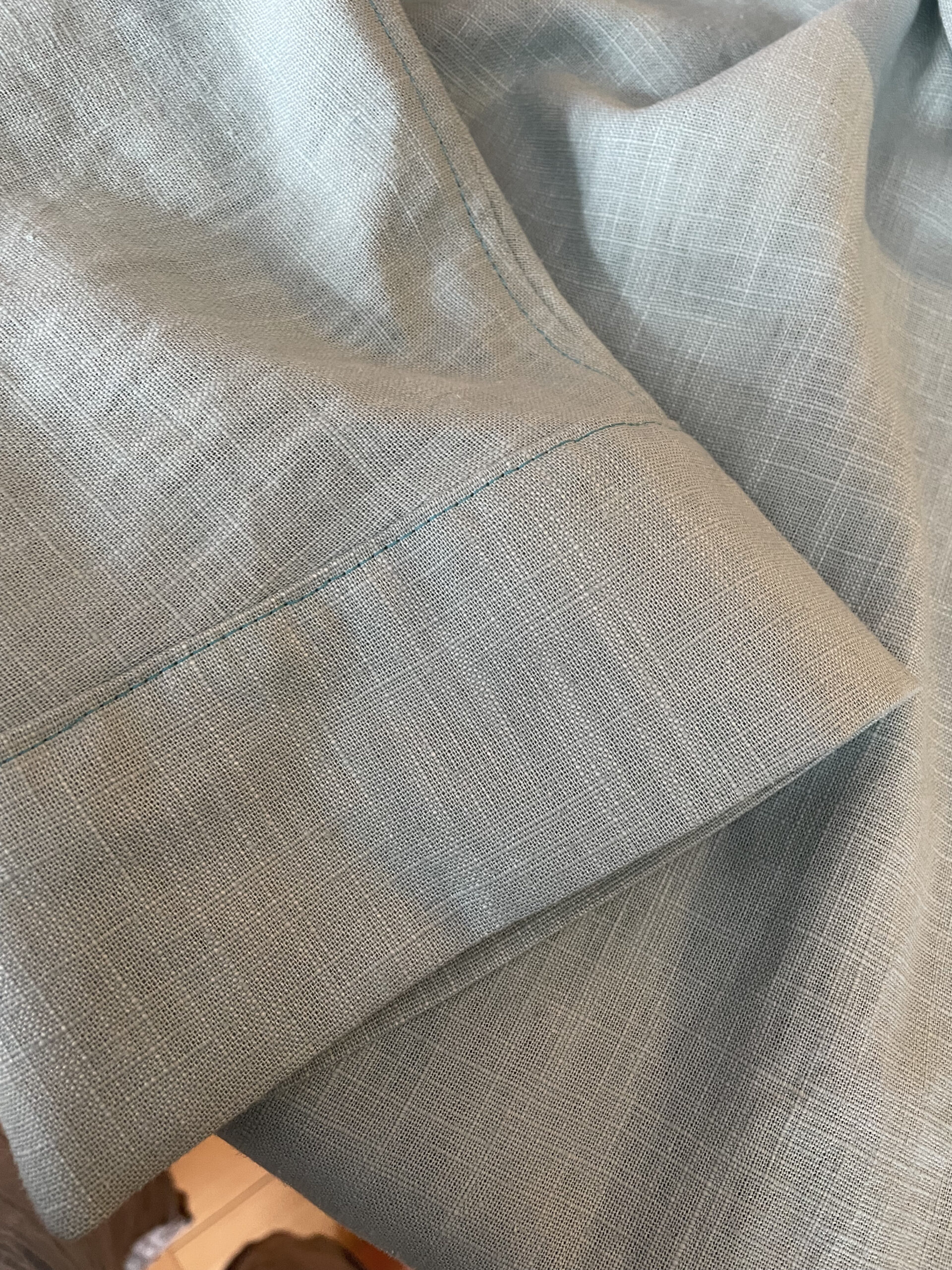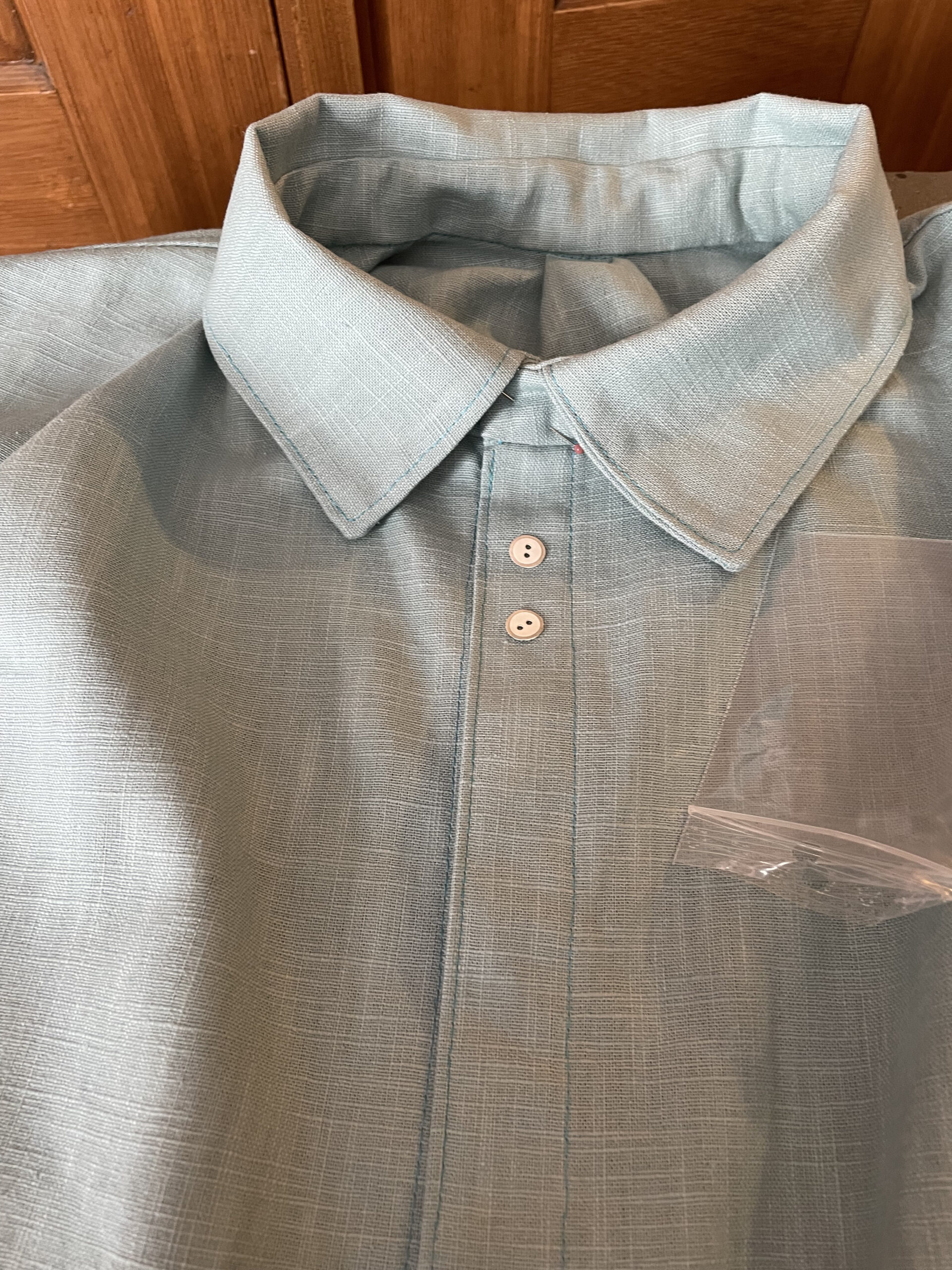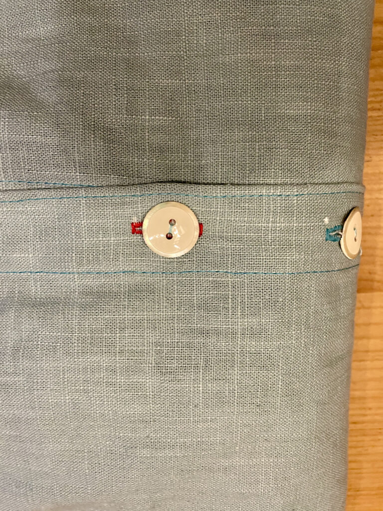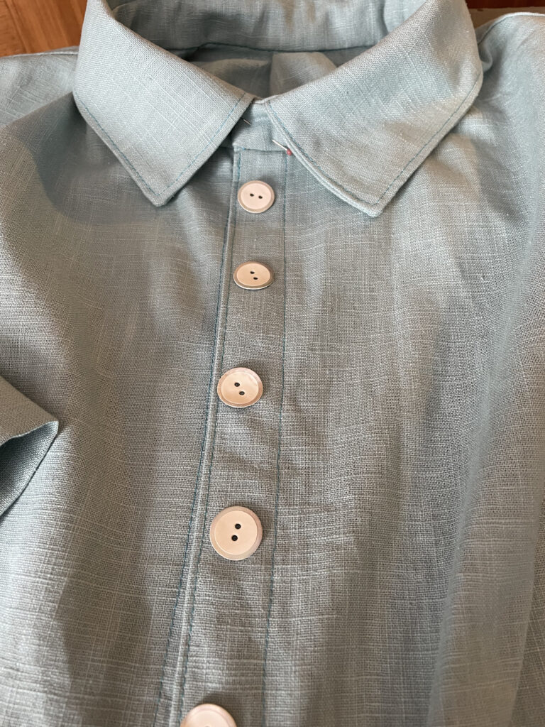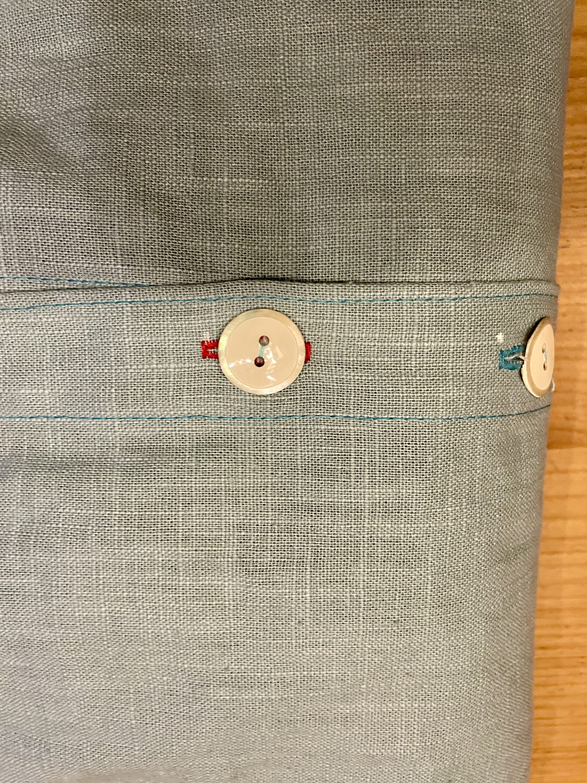 Modell: Bluse, Blusenkleid Cocoon von Schnittduett in der langen Länge mit 3/4-Ärmeln, Material inklusive Knöpfe von www.kreando.ch. In Tat und Wahrheit ein wunderschönes, sanftes grün-blau, heisst ja auch Aqua. Und ja, es müssen die 18mm-Knöpfe sein.