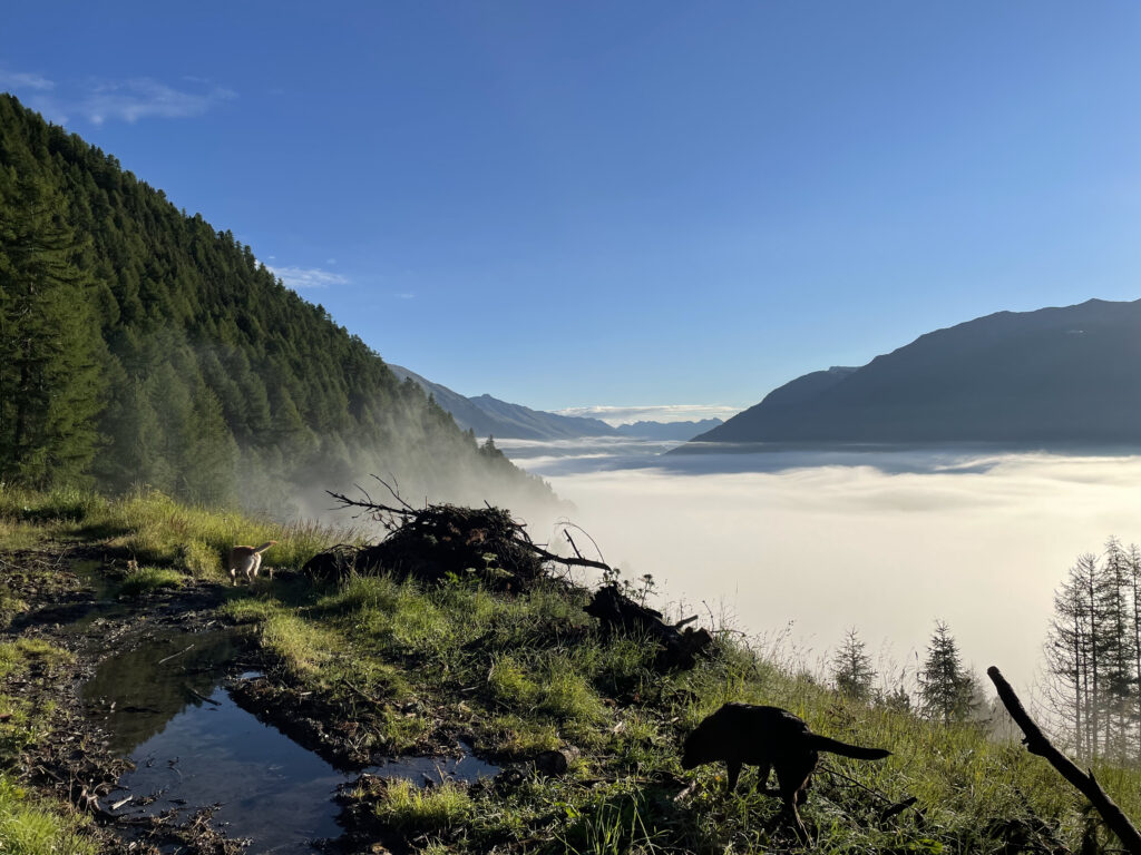 Es gibt nebst dem vielen Nass auch ganz viel Wasser in Flüssen, Seen und am Boden. Wasserarbeit rund um die Uhr! den Hunden gefällt’s und was soll’s, Hosen trocknen auch wieder.