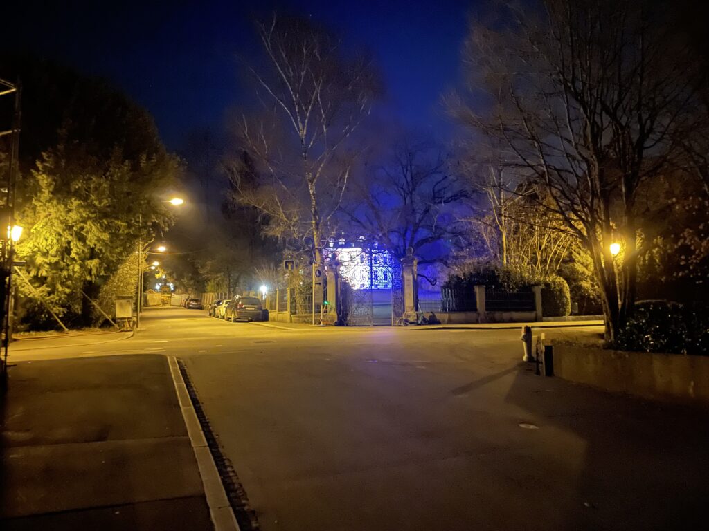 Verschiedene Gebäude in der Stadt sind blau-gelb angestrahlt in der Nacht. Auch das Konsi grad um die Ecke. Als Erinnerung dafür, dass der Krieg in der Ukraine nicht vergessen gehen darf.