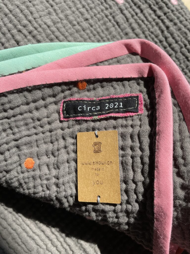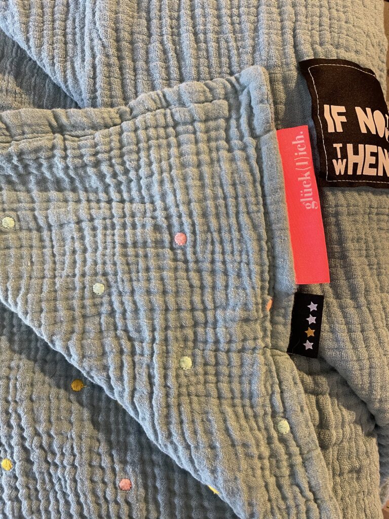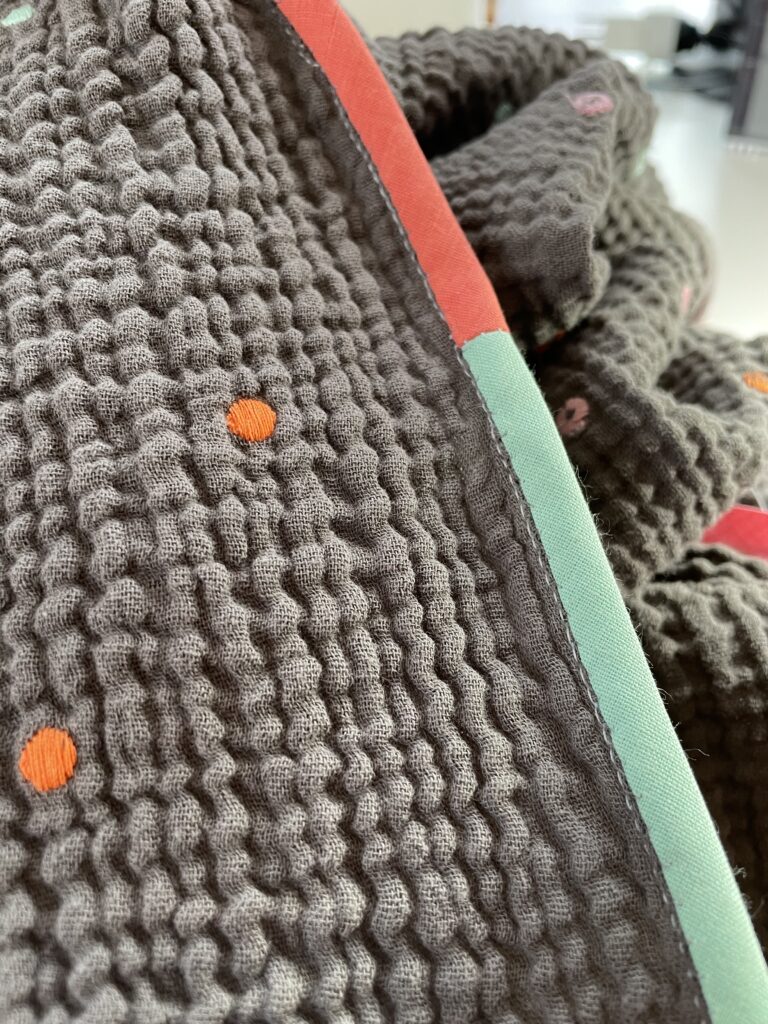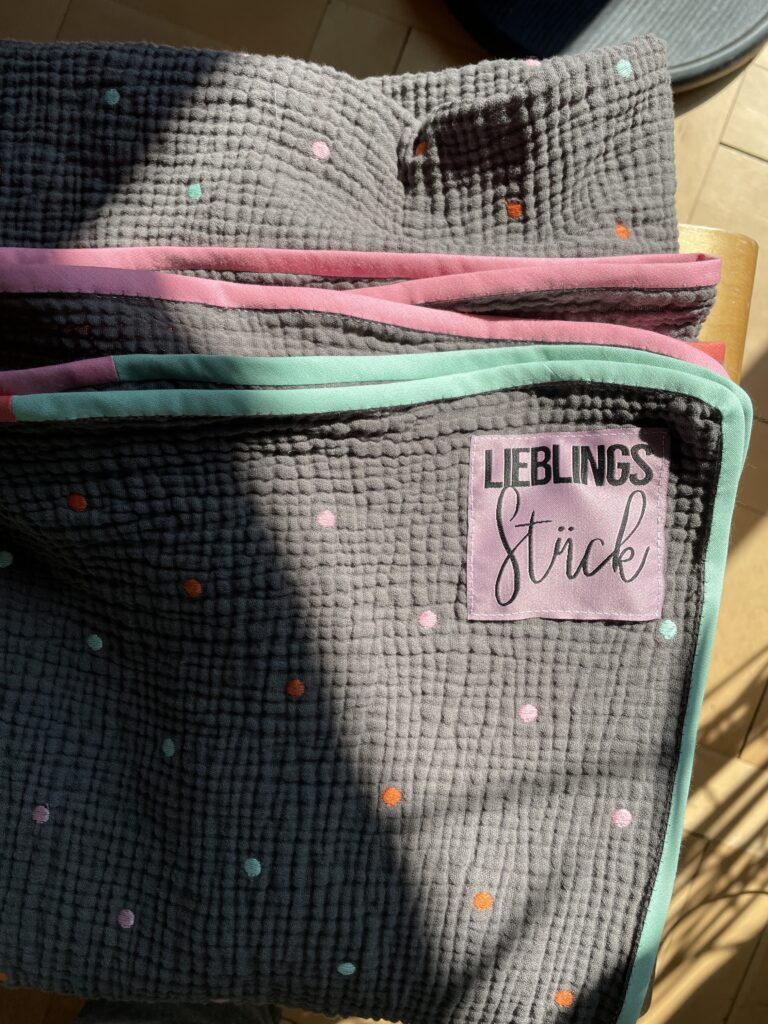 Hier im Bild oben die blaugrundige Variante, verstürzt mit einem unifarbenen Musselin und am Rand abgesteppt und die graugrundige Version eingefasst mit unifarbenem Schrägband. Leider nicht in Musselin, aber in den Farben der Punkte. Macht was her, wärmt, macht Spass und… ist ein perfektes Geschenk für alle, die schon (fast) alles haben.