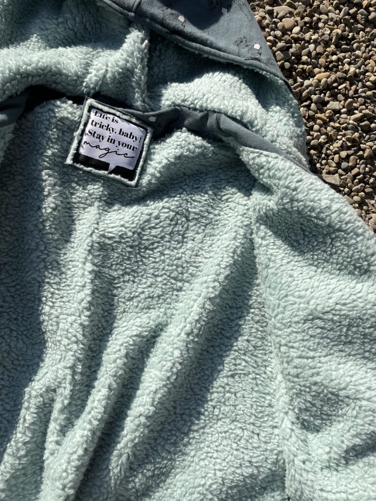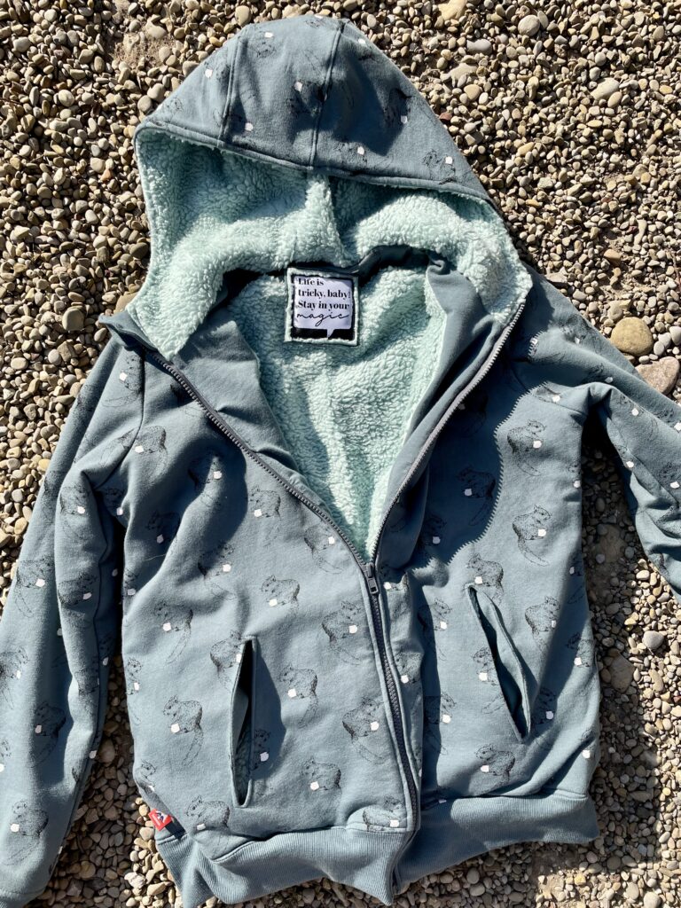 Inspiert von www.followme-design.ch habe ich Version II genäht. Stark verbessert. Ich habe eine Nummer größer gewählt als üblich und den Schnitt Lady Sky von mialuna. Fazit: passt, sitzt, wackelt und hat Luft! ich bin sehr zufrieden, wenn man mal von einem kleinen Schönheitsfehler (den eh nur ich sehe) absieht. Ärmel sind mit Sweat gefüttert – der Kuschelbuschel ist nur an den Vorder- und am Rückenteil und in der Kapuze zu finden.