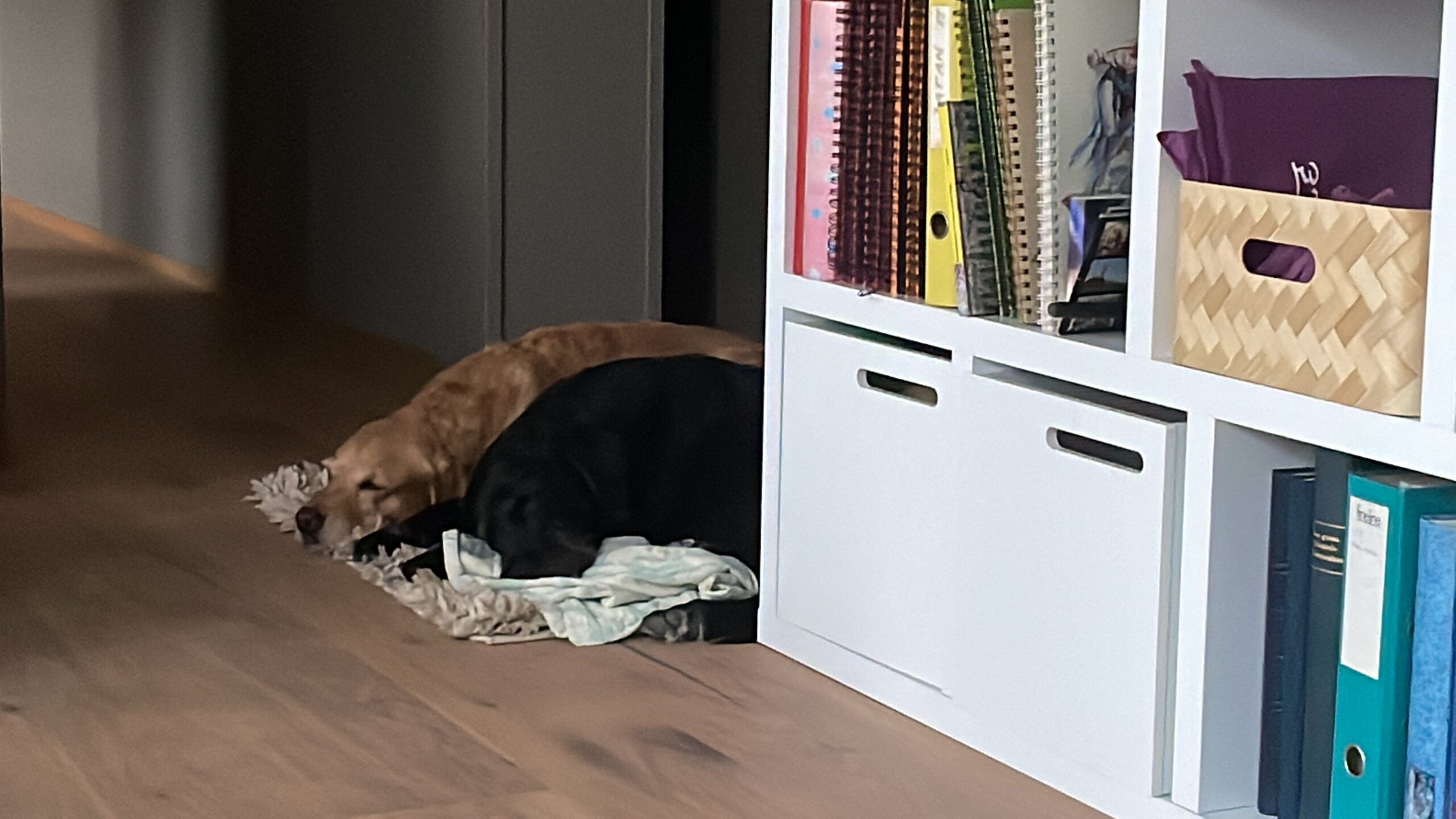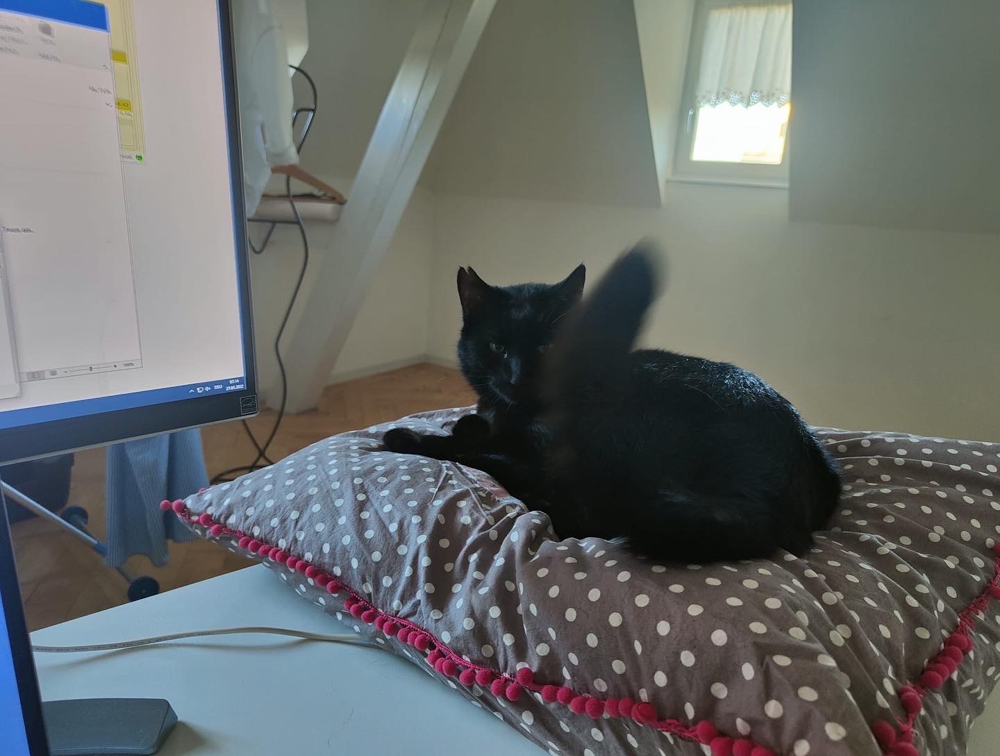 Wir räumen ein, sortieren, sortieren um, definieren, suchen, graben, finden… und haben dauernd Besuch. Der Schreiner ist hier, der Sanitär bringt -schon wieder- die falsche Abdeckung, der Elektriker staunt und im Garten geht die Post ab. Nero findet das alles doof – meistens kommt er erst abends wieder nach Hause, wenn Ruhe eingekehrt ist. Dann geniesst er das grosse Bett von AnnA und lässt sich den Bauch kraulen. Oder verschwindet beleidigt darunter in seiner Kiste… oder aber er thront im Homeoffice auf dem Kissen. Die rosa Bömmseli frisst er übrigens Stück um Stück ab…