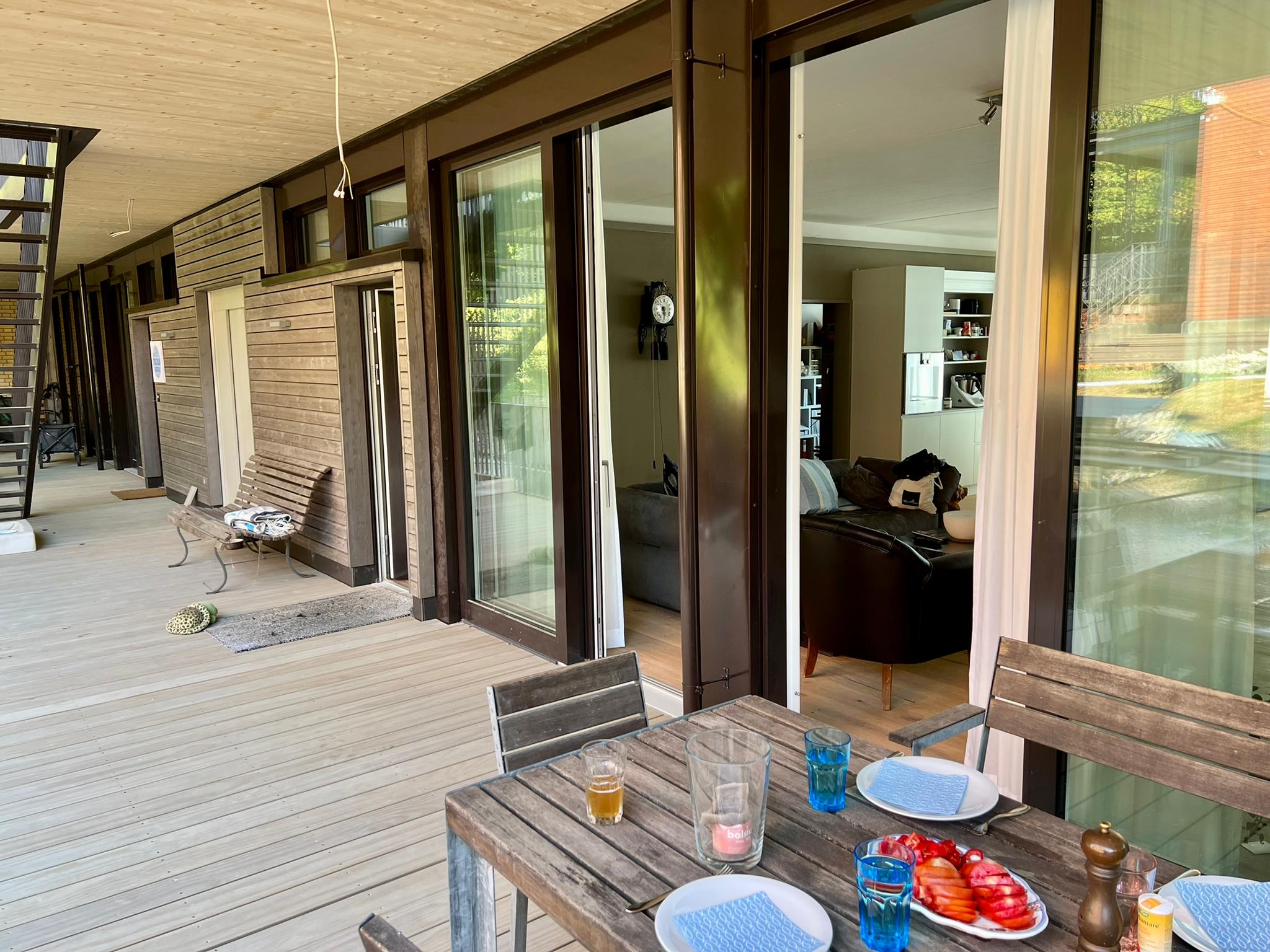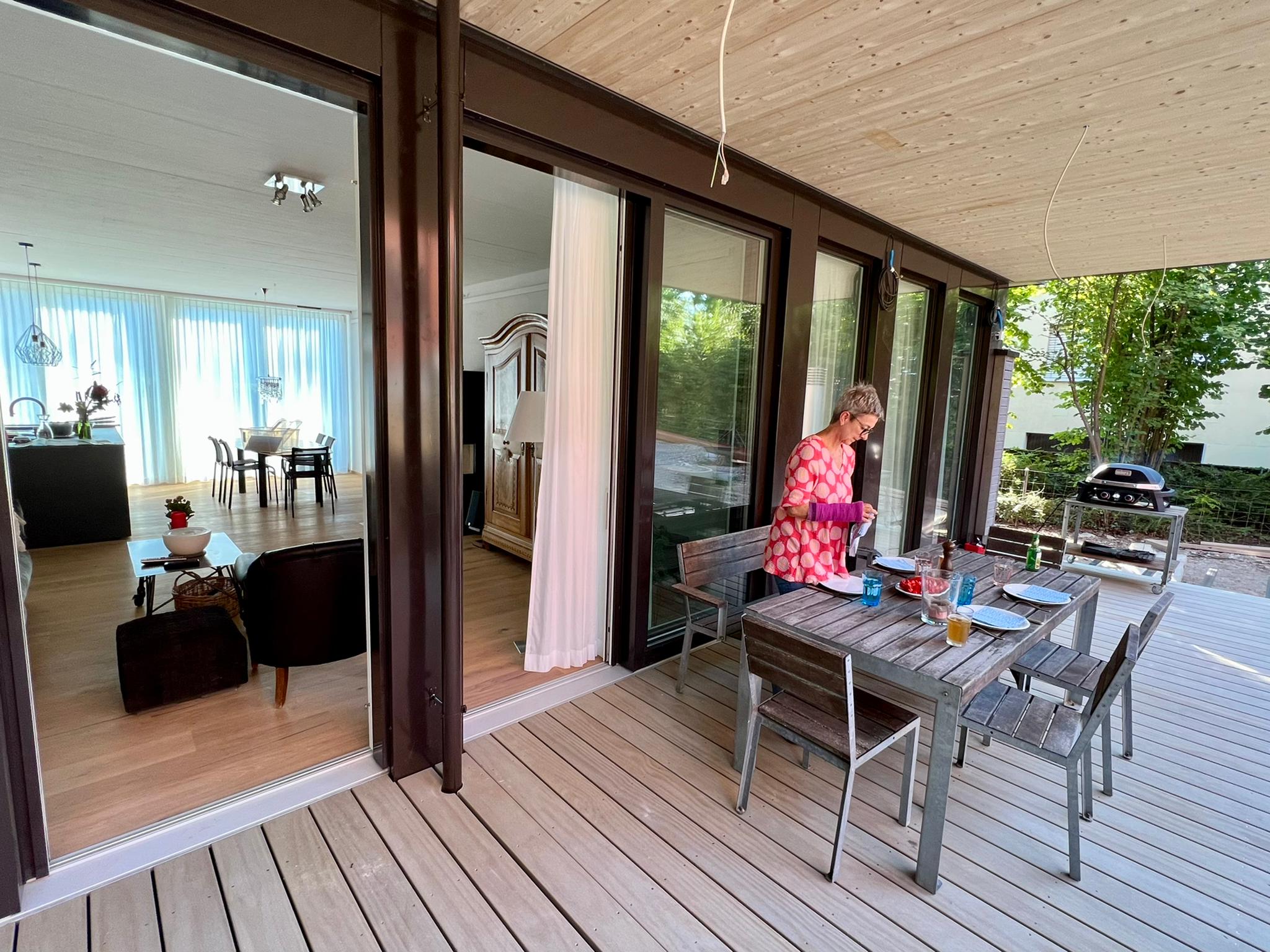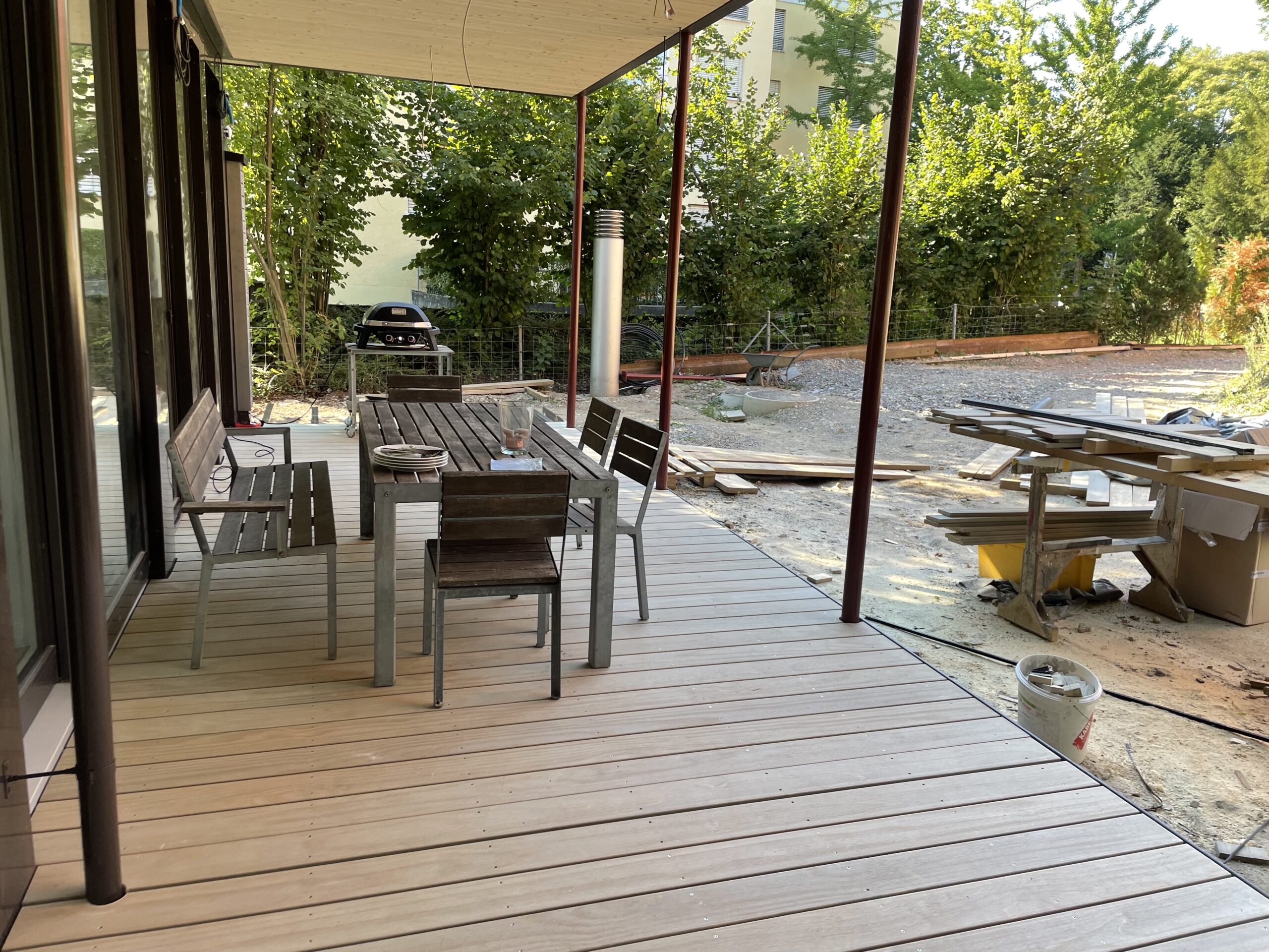 Einhändig geht leider nicht ohne Hilfe und so habe ich etwas früher als geplant das Engadin verlassen und bin zurück nach Winterthur gereist. Nur um da festzustellen, dass auf der Baustelle so ziemlich rein gar nix erledigt wurde… einhändig kann ich zwar wenig tun, aber ausrufen und rumtelefonieren geht einwandfrei. So ist in der Zwischenzeit doch einiges auf dem Bau geschehen. Endlich können wir unsere Porch, unsere Laube mit Belag geniessen. Herrlich bei diesen Temperaturen!