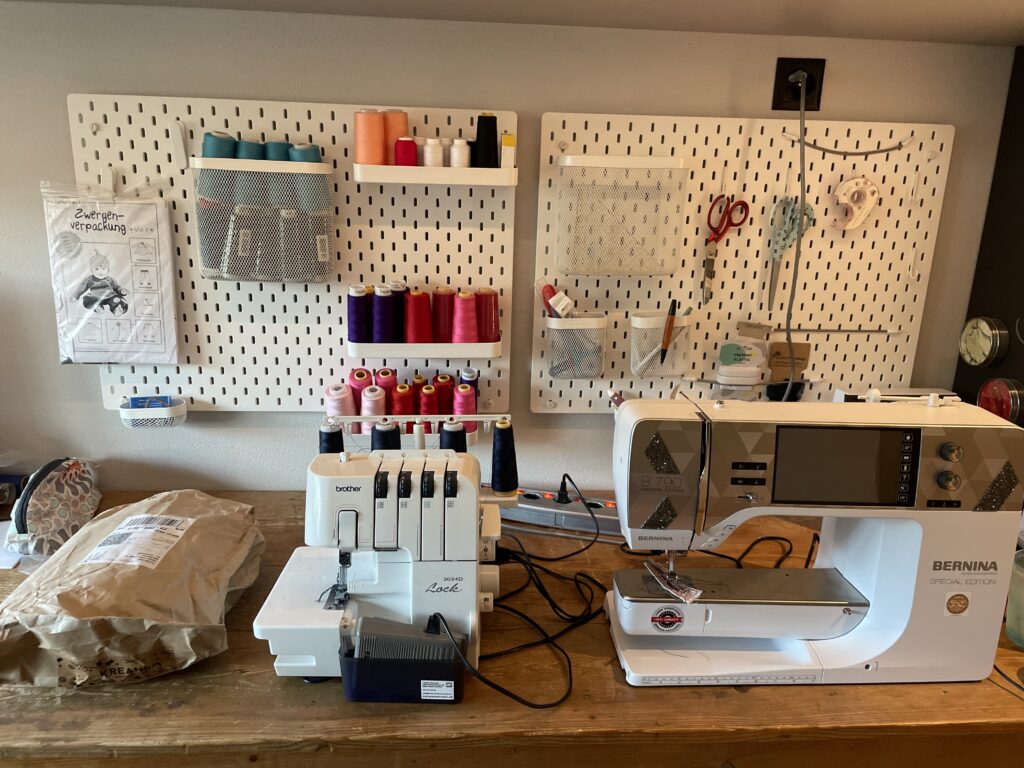 Ordnung muss sein – ich bin schwer begeistert, ob meiner Nähchaosbeseitungsanlage, die mir in verdankenswerter Weise der nette Markus an die Wand getakert hat. Echt cool das Teil. Und ja, falls jemand bei Ikea vorbei fährt, bitte für mich noch einmal drei dieser Tablare, damit ich alle Overlockfäden nett einräumen kann. Und 4 Klammern für das Zettelizüügs bitte!