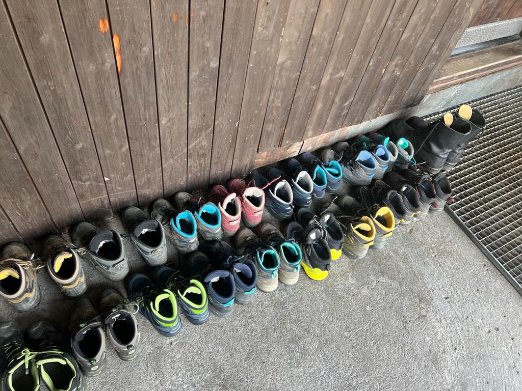 …wir stellen grad mit grosser Freude fest, dass irgend etwas von unseren verzweifelten Erhziehungsbemühungen doch hängen geblieben sein muss. Die Schuhe ganz rechts, die allergrössten übrigens gehören zu unserer Familie… Pfingstlager im Glarnerland, im Schüttstein der Nation und das bei schönstem Wetter!