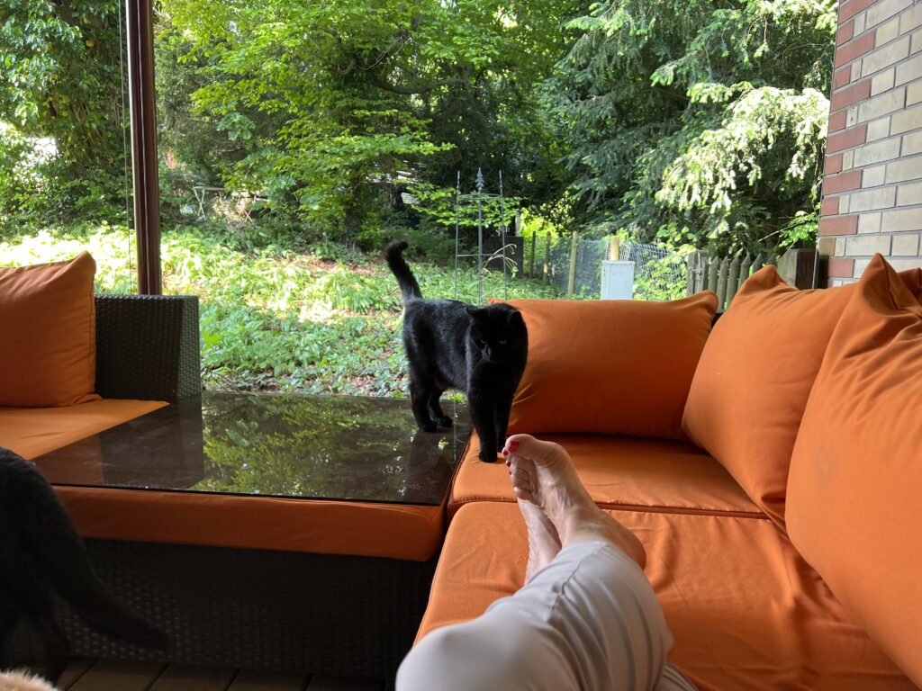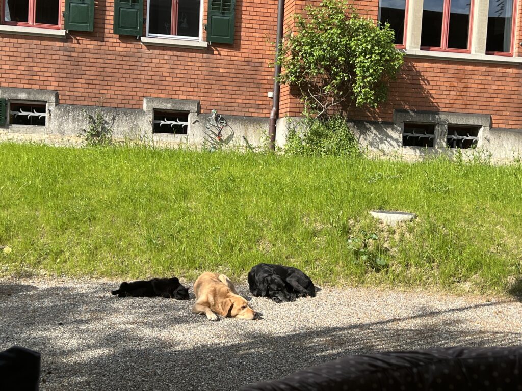 Grüner Spargel, Hunde rösten im Innenhof, die Gräser blühen, die Männer niesen… Frühling, es ist wunderbar. Und wie es sich für den Frühling, pardon: Frühsommer gehört, haben wir selbstverständlich auch noch den Aussenraum gefidelt und die Lounge in Betrieb genommen. Nero inspiziert sie skeptisch und gähnt auf dem warmen Dollendeckel!