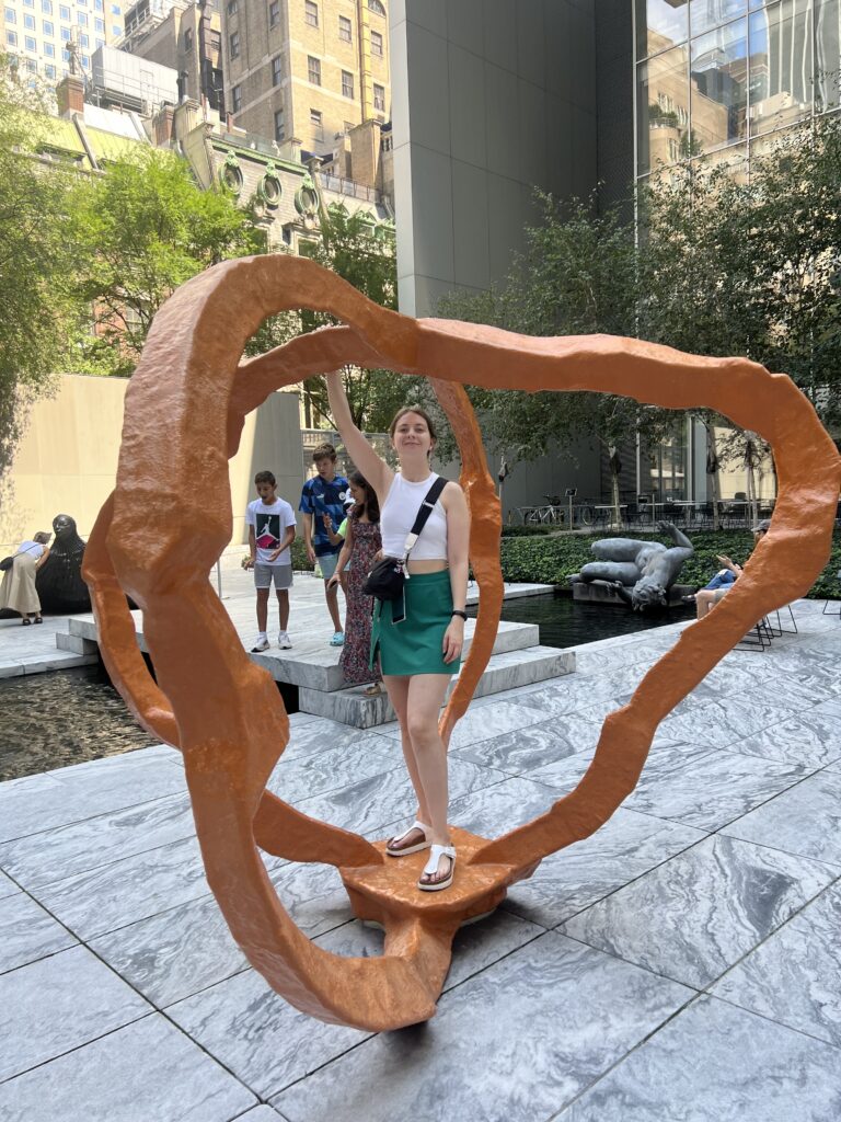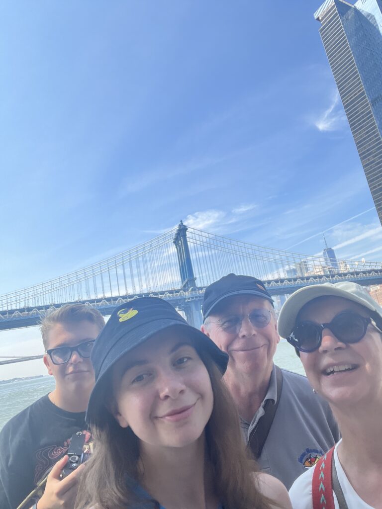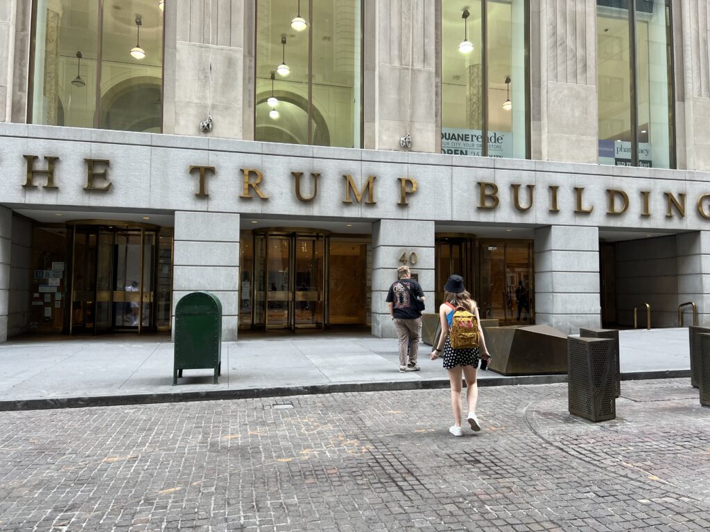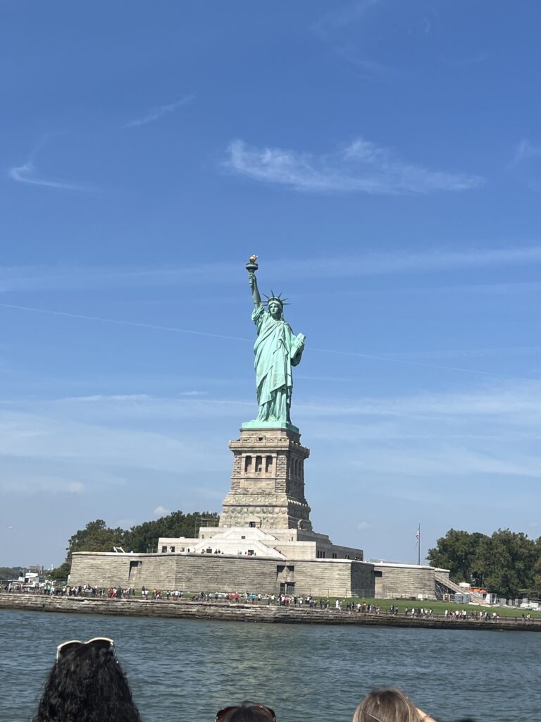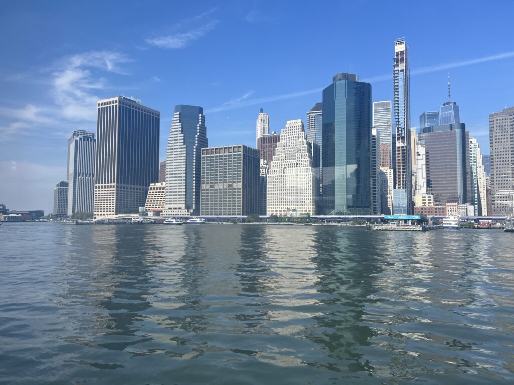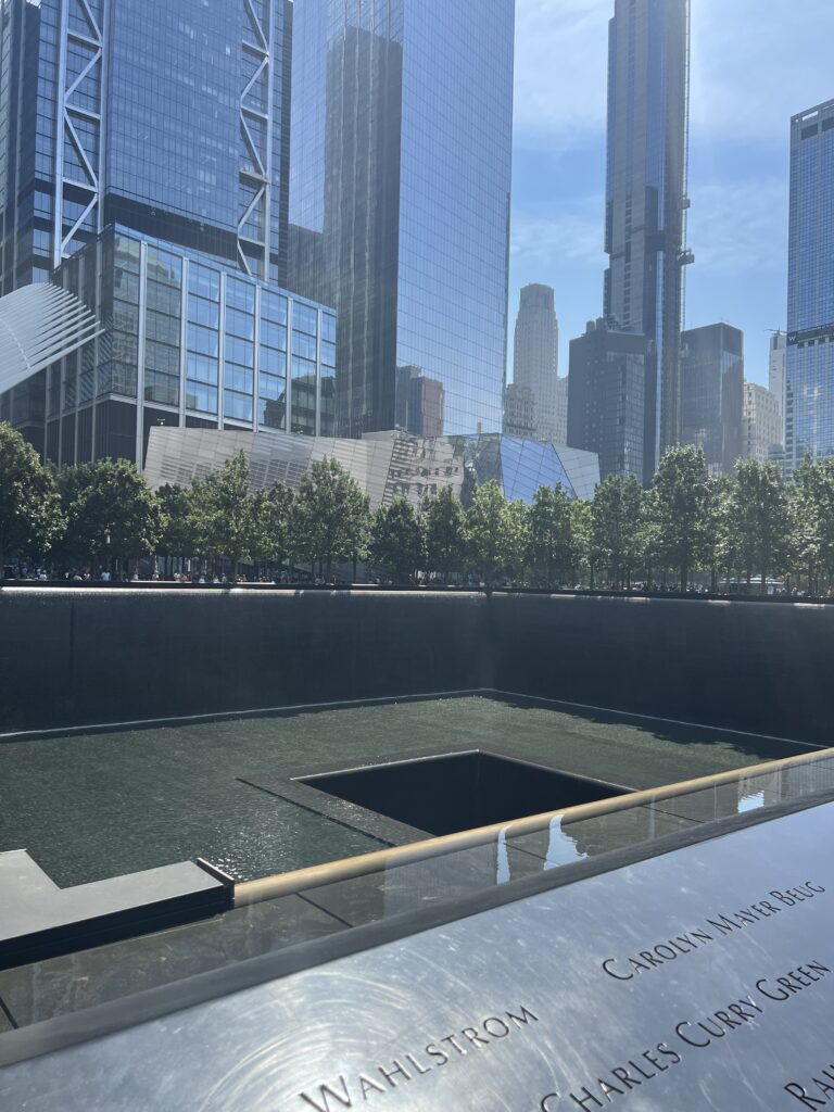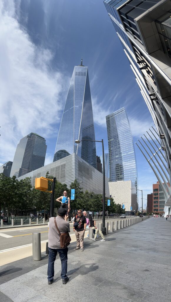 Der nächste Tag ist heiss… wir verbrutzeln ums Haar beim Warten auf unsere Schiff, dass uns durch das Hafenbecken fahren soll. Es hat 30′ Verspätung… das Warten lohnt sich allerdings, der Anblick der Stadt und -natürlich- der Statue of Liberty ist einige Schweisstropfen wert. Wir traben durch die Wall Street – Eric ist etwas enttäuscht, sehen im tiefen Vorbeiflug den Trump Tower (na ja, grosskotzig halt) und sind tief beeindruckt vom 9/11-Memorial. Sowohl künstlerisch, als auch wirkungsmässig ein geniales Monument. Das an den Wänden herablaufende Wasser kühlt angenehm, die Bäume ebenso, wir sind gottesfroh, denn die gut 37°C Aussentemperatur haben es in sich.