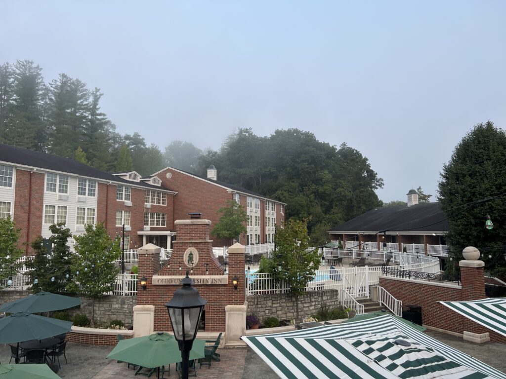 Infolge «Family Weekend» der Universitäten ist Athens / OH komplett ausgebucht und pumpenvoll. Wir landen etwa 30′ Fahrzeit ausserhalb – es hätte also übler sein können. Wunderbare ruhige Cabin, mit allem, was das Herz begehrt im Burr Oak State Park. Viel Schlaf, viel Ruhe….