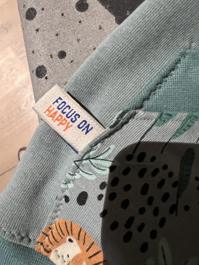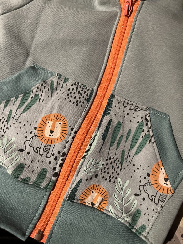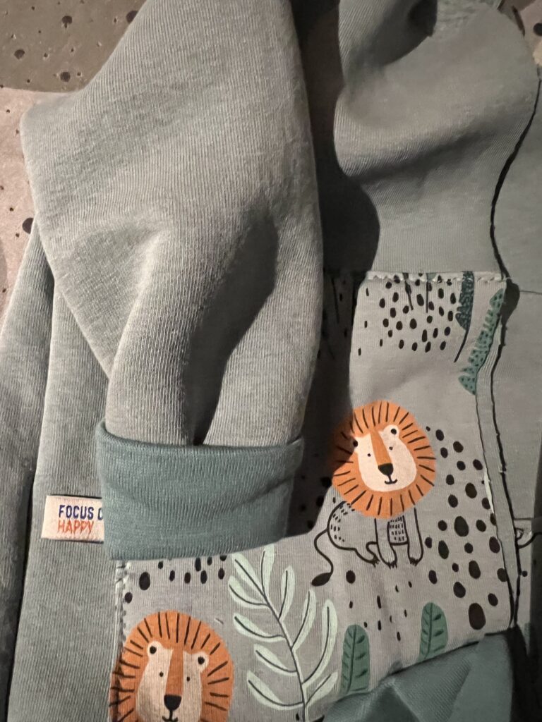 Stoff: Unifleece aus der Restenkiste (ursprünglich von Leni P-Punkt), Löwenstoff ebenfalls aus der Restenkiste, Bündchenstoff Restenkiste ursprünglich von www.lotzis.ch in Silvaplana. Empfänger Liam, geboren Juli 2023, pünktlich zur Maturfeier des grossen Bruders übrigens 🙂