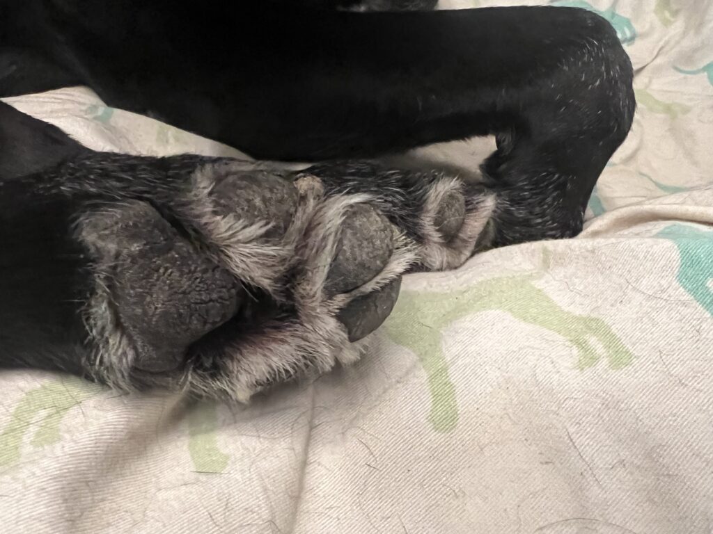 Und dann, nach grandiosem Xmas-Trial-Training bei Jason Mayhew und Paul Tattney (Temperaturen perfekt, kein Regen, nette Leute, netter Hund) mit Elio eine geschäftliche Weihnachtsfeier im Abendprogramm und kurz davor noch festgestellt… der Bob wird älter. Wie viele Kilometer ist der Bob mit diesen Pfoten wohl schon gehopst? wo hat er überall rumgeschnüffelt?