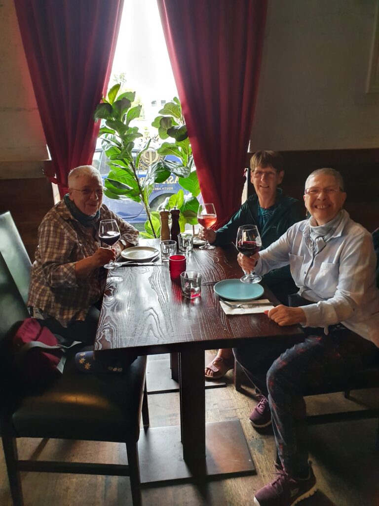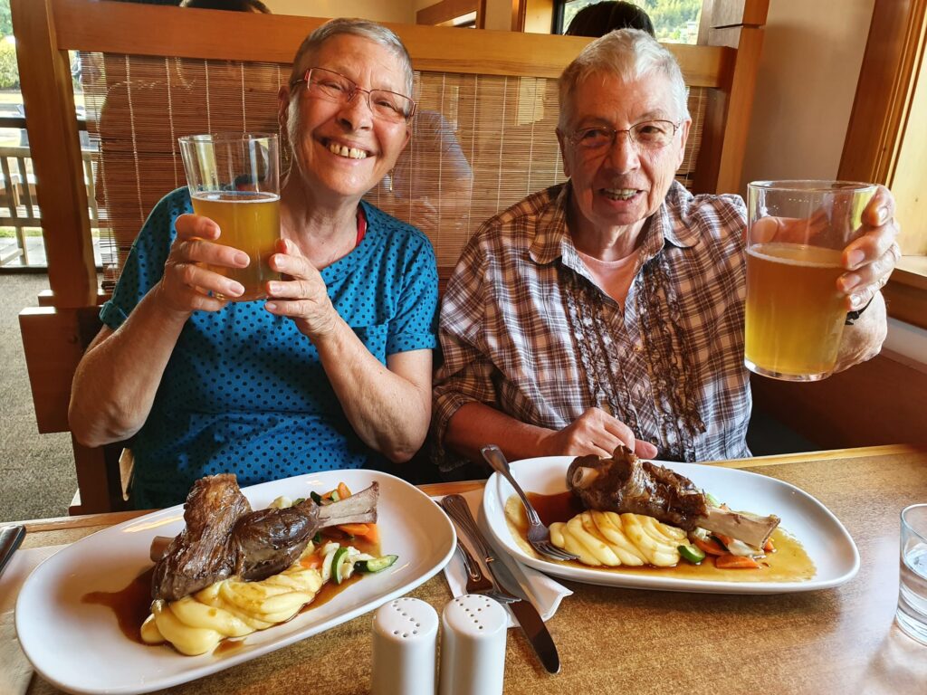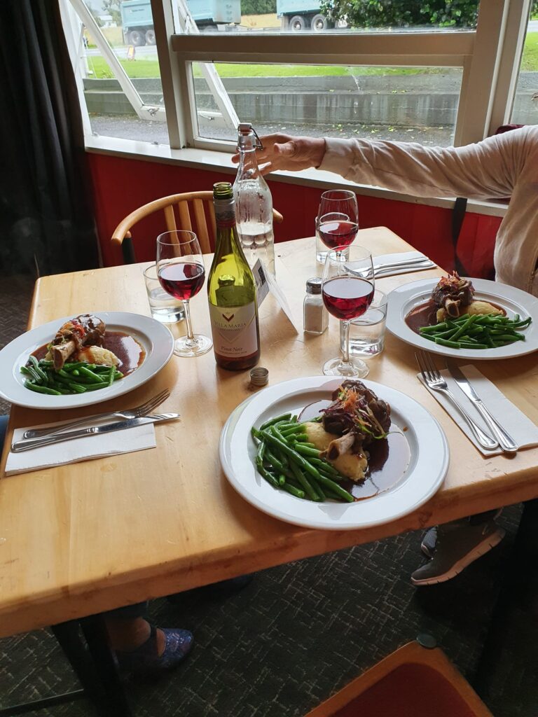 Grad angekommen beim Fox Glacier… und subito zum nächsten Pub! Wenn das nur gut kommt, mit dem «Purple Death»-Wein!