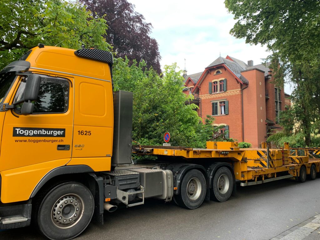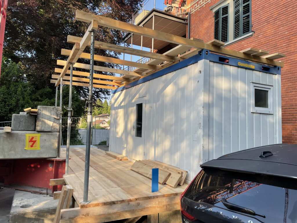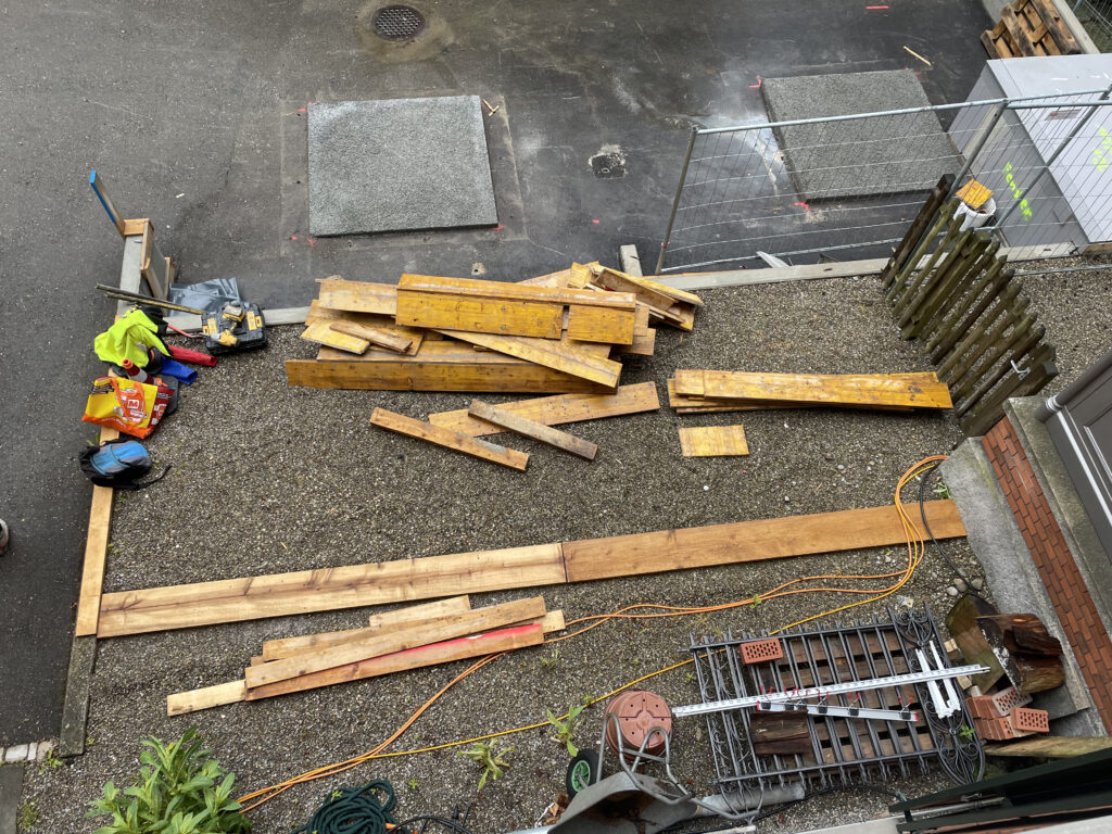 Es geht weiter im Text – noch immer Baustelleninstallation. Am Montag werden Fundamente für den Kran betoniert, am Dienstag kommt er dann – wahnsinnig gross von unten. Und die Männer, die Affen gleich darauf herumklettern. Brrr… mir wird vom Zusehen schon ganz anders. Die Strasse ist gesperrt, die Leute haben was zu reden 🙂