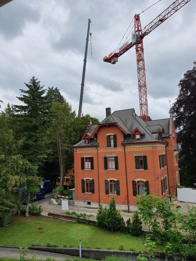 In der Baugrube werkelt der Baumeister, so ganz verstehe ich noch nicht, WAS da genau gemacht wird. Spezielle Erdung des Krans, wegen der Bahn, ein Telefonkästli wofür auch immer (ok, es sieht einfach so aus, noch weiss ich nicht, was sich darin verbirgt), die Rosen blühen bezaubernd an der Bahnlinie und wir sind einmal mehr eifrig am Farben diskutieren.