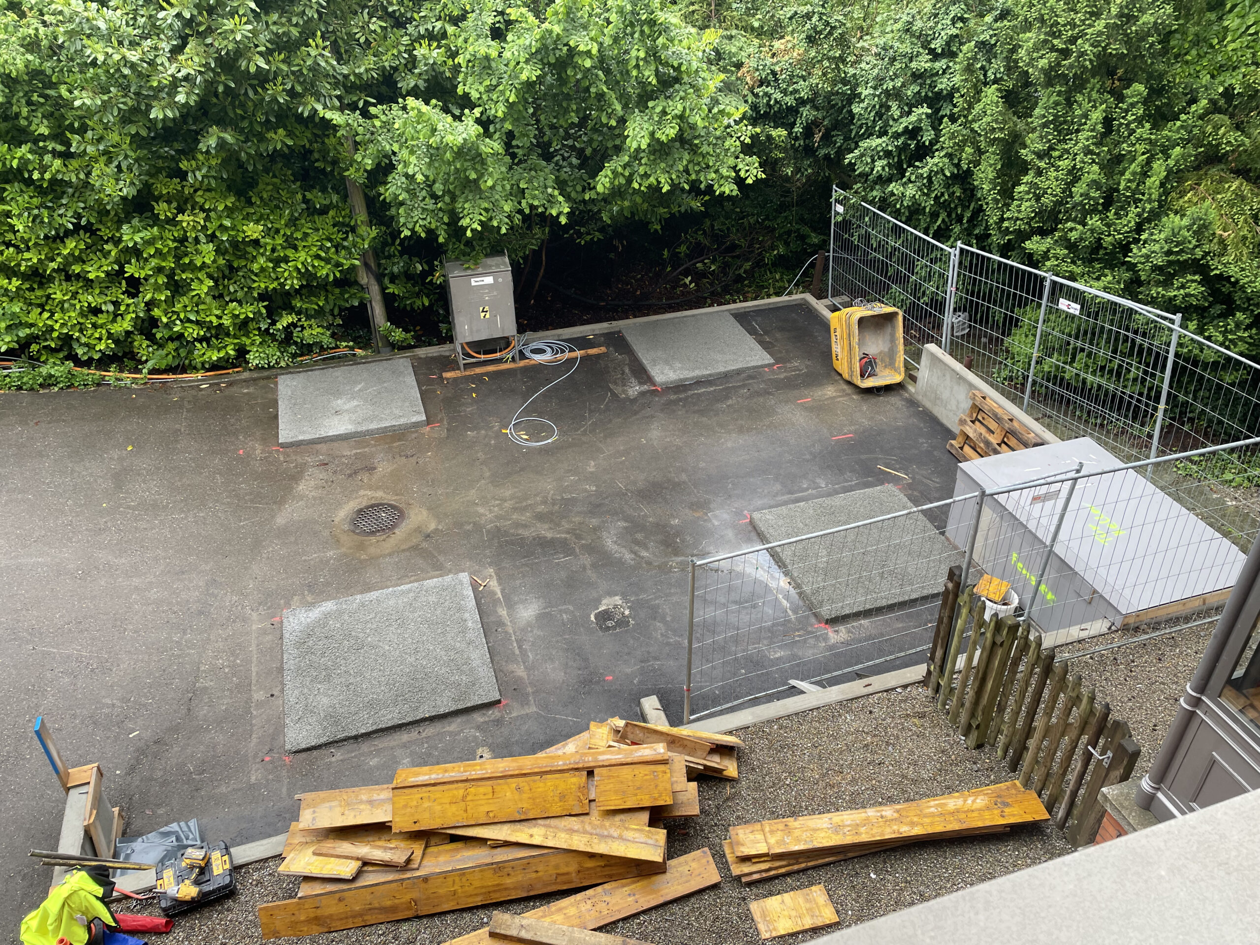 In der Baugrube werkelt der Baumeister, so ganz verstehe ich noch nicht, WAS da genau gemacht wird. Spezielle Erdung des Krans, wegen der Bahn, ein Telefonkästli wofür auch immer (ok, es sieht einfach so aus, noch weiss ich nicht, was sich darin verbirgt), die Rosen blühen bezaubernd an der Bahnlinie und wir sind einmal mehr eifrig am Farben diskutieren.