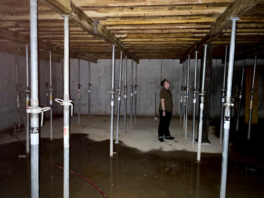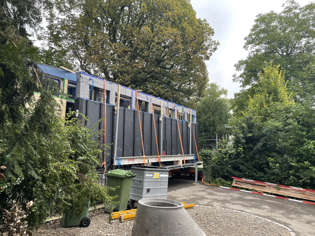 Am Dienstag «wird» das Erdgeschoss ganz plötzlich real. Die Aussenwände kommen. Am frühen Morgen. Auf dem Tieflader…