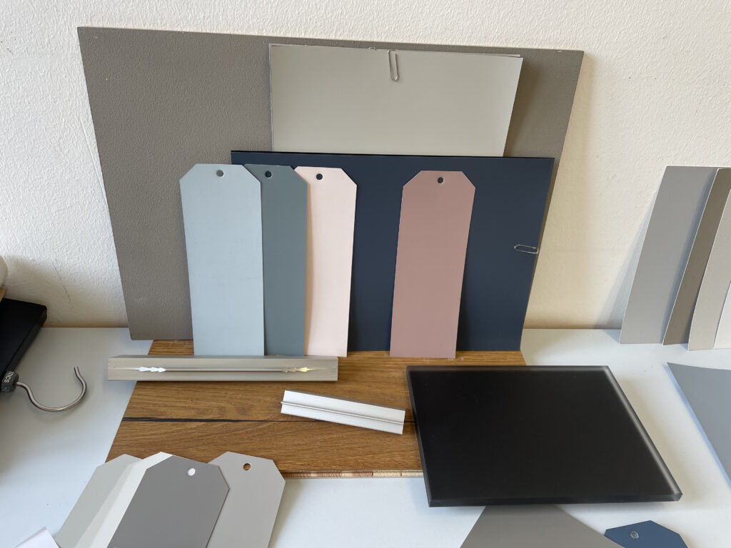Auch in der Farbfamilie kommen wir einen Schritt weiter. Die Kücheninsel wird dunkelblau, die Abdeckung ähnlich, die Hochschränke dahinter erdig, die Wand dahinter dunkelerdig, das ganz kombiniert je nach Raum mit hellblau, türkis oder rosa-altrosa Akzenten. Und dazu den dunklen Eichenfussboden. Es wird. Zäh, aber es wird…