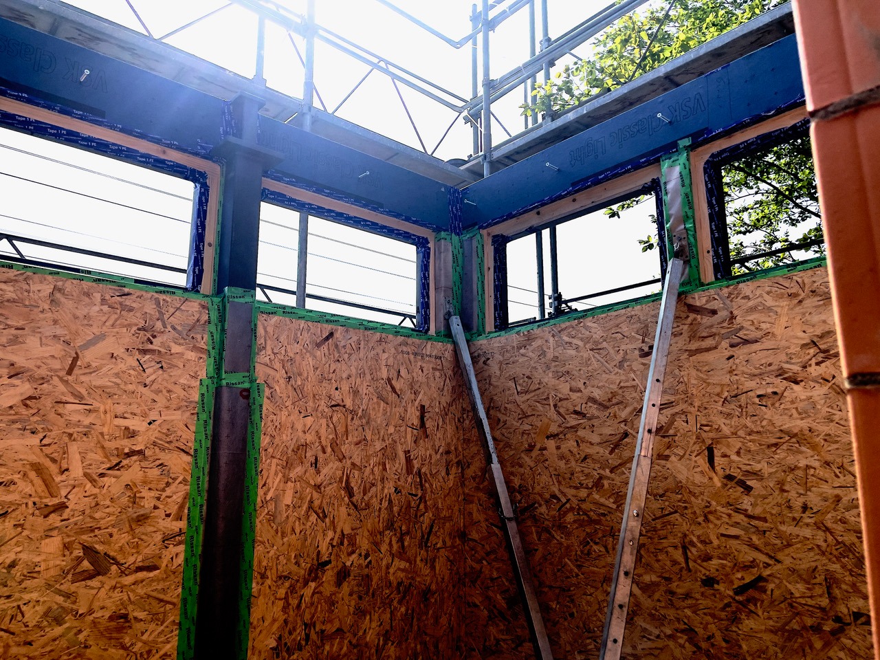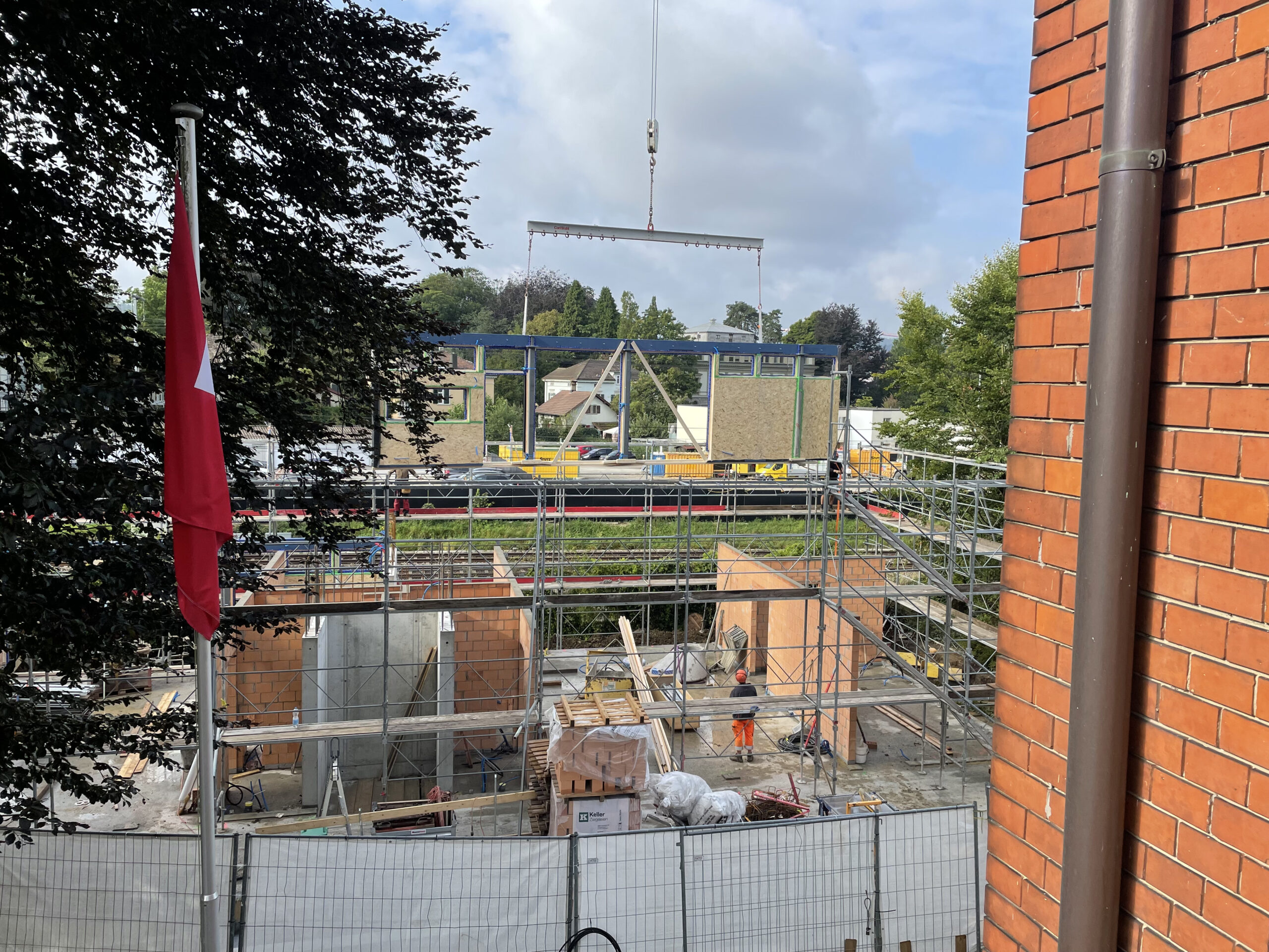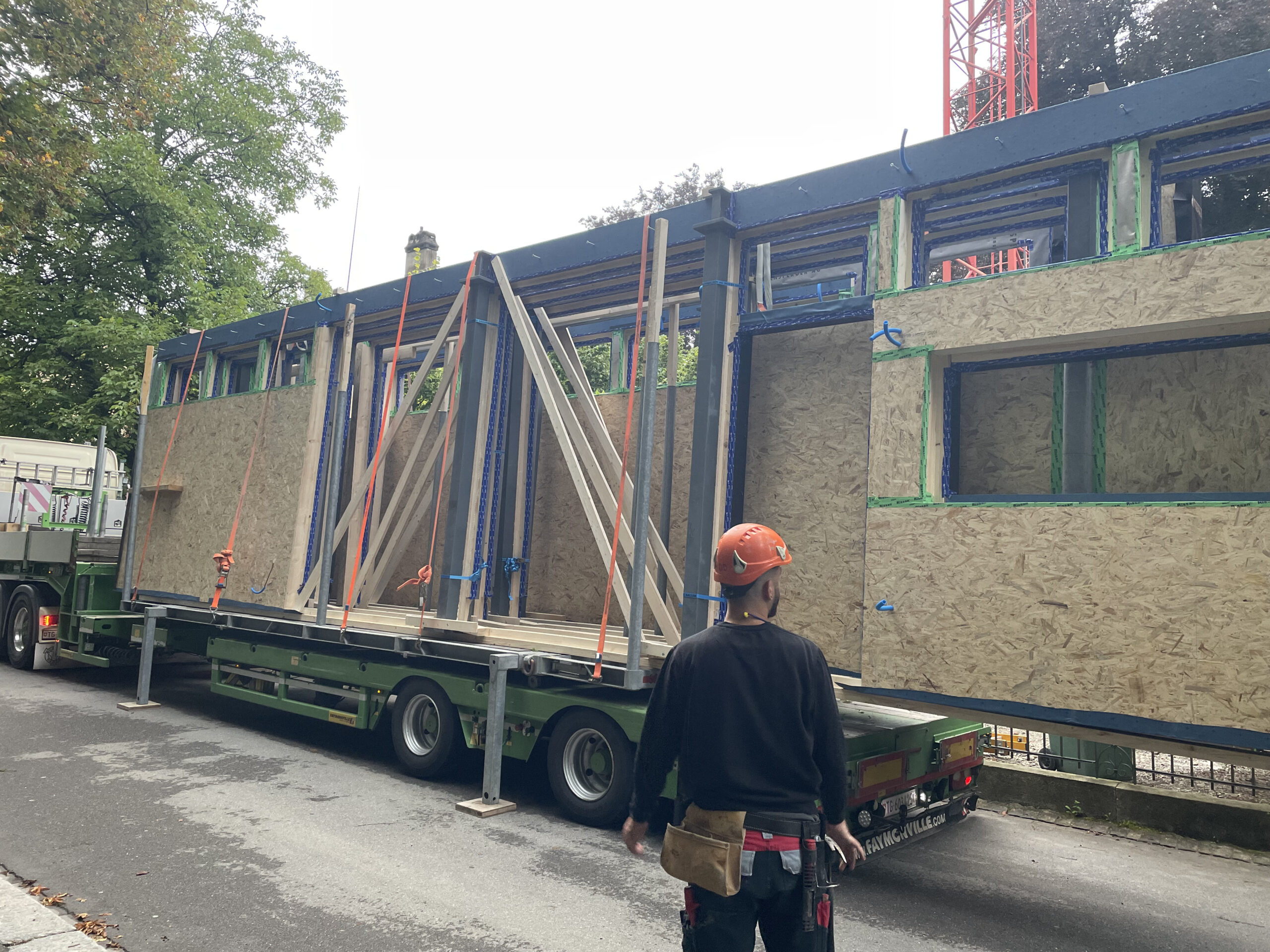 Am Dienstag «wird» das Erdgeschoss ganz plötzlich real. Die Aussenwände kommen. Am frühen Morgen. Auf dem Tieflader…